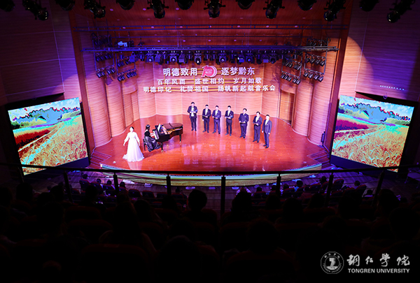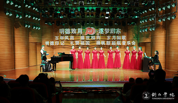 梵净日出喷薄如虹,盛开出了明德融汇时光的灿烂;梵天净土和桃源铜仁刻下了大学之道,写下了隽永华章。奋进的百年,豪迈的百年,以明德印记、大山品格,以青春芳华、明媚诗行,跨越发展,奋进新时代。在第三篇章中,独唱《花开新时代》、小合唱《青春舞曲》、四重唱《奋进新时代》等,节奏欢快、歌声嘹亮、气势如虹,铜院师生以歌传情,用最真挚的情感向母校送上最美好的祝愿。一朝铜院人,一生铜院人,铜院始终是每位铜院人魂牵梦绕、心之所向,永远的家园、后盾和港湾。
