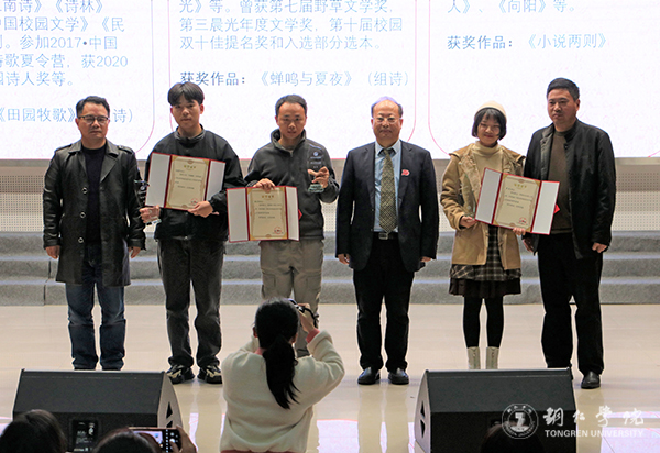 颁奖典礼上,评委组长安元奎教授在发言中说,bv伟德国际1946已经走出了芦苇岸、喻子涵、末未等诗人,他们活跃在全国的诗坛上。如今,在bv伟德国际1946领导的大力支持下,在写作研究院、人文学院老师的带领下,bv伟德国际1946晨光文学社风声水起,学校的文学创作和文学研究也方兴未艾,晨光文学社正在成为黔东、乃至贵州文坛一道亮丽的风景,希望本次颁奖典礼能够激励诸多初展才情的同学,坚持总会成功,晨光的明天属于年轻的学子们。