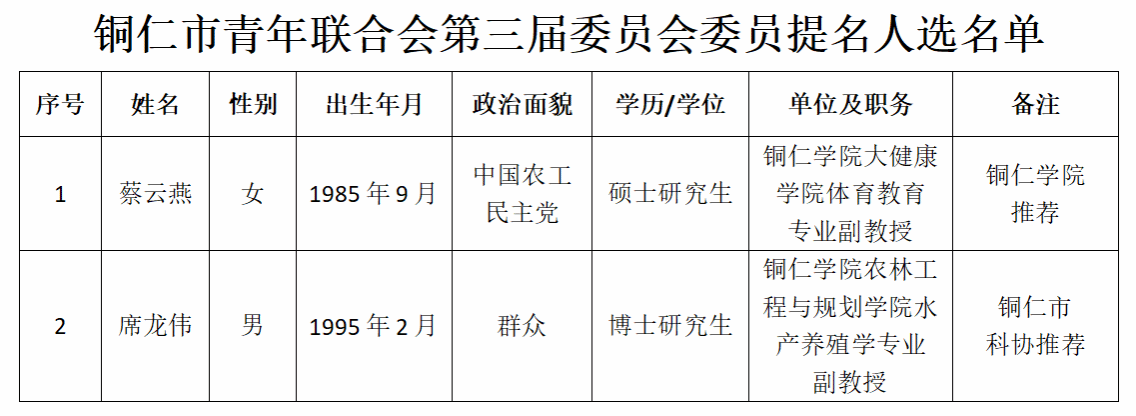 党委组织部、校团委根据共青团铜仁市委、铜仁市青年联合会《关于协商开展铜仁市青年联合会第三届委员会委员推荐人选考察工作的函》的相关要求,经考察审核,拟提名下列人员为铜仁市青年联合会第三届委员会委员人选,现予以公示,广泛征求意见建议。