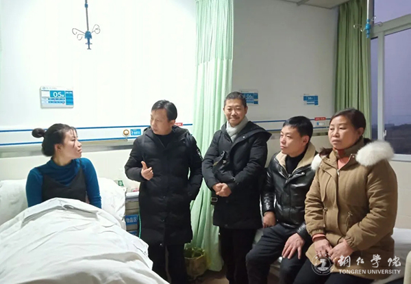 在收到张义乾受伤的消息后,国际学院党委书记张志会、学生科科长李念以及辅导员何历蓉及时赶到医院,询问了张义乾当时的身体状况,安抚她的心情,并鼓励她要勇敢、坚强、乐观地面对困难,积极配合治疗争取早日回到学校。