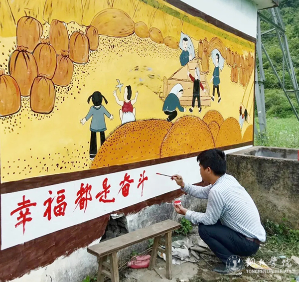 在墙画绘制过程中,我到处走访村干部和农户,了解该村情况和诉求。结合当前党的政策方针及本地风土人情,因地制宜,细心的给同学们提供创作思路。绘制现场,同学们满怀热情、团结协作,服从安排,认真的完成每一幅画。不管天晴下雨,我始终与同学们一道,风雨无阻,将青春和汗水抛洒在偏远山村的田间地头,争当脱贫攻坚决战场上的文艺先锋。