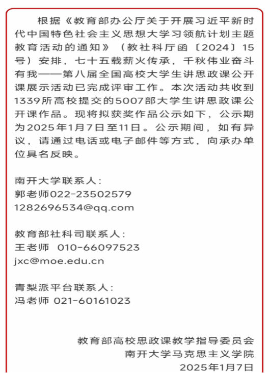 全国高校大学生讲思政课公开课展示活动由教育部高等学校思想政治理论课教学指导委员会主办,是习近平新时代中国特色社会主义思想大学习领航计划主题教育活动之一。本届赛事分为本科组、高职组和专项组三个组别进行评选,汇聚全国1339所高校的5007部佳作,角逐激烈。其中,本科组共评选了特等奖16项、一等奖48项、二等奖项95、三等奖159项,共318项。