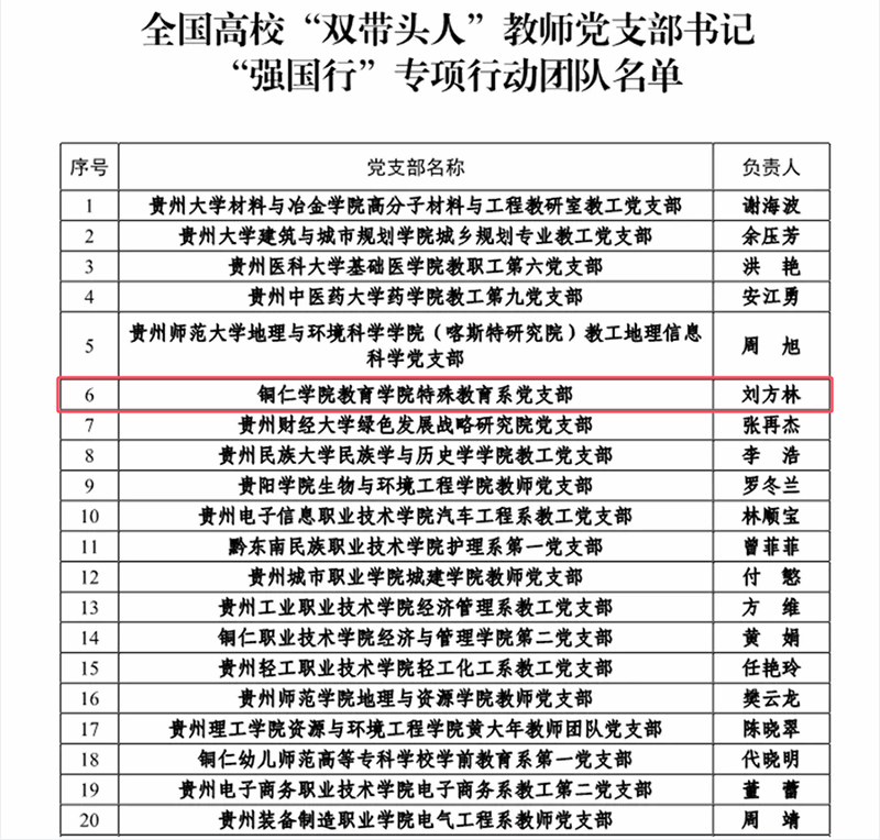 近日,全国高校“双带头人”教师党支部书记“强国行”专项行动团队名单公布,1486名高校“双带头人”教师党支部书记(以下简称“双带头人”)入选,覆盖全国31个省(区、市)和新疆生产建设兵团的953所高校。其中,贵州省有20高校“双带头人”教师党支部书记入选伟德官网教育学院特殊教育系党支部书记刘方林入选。