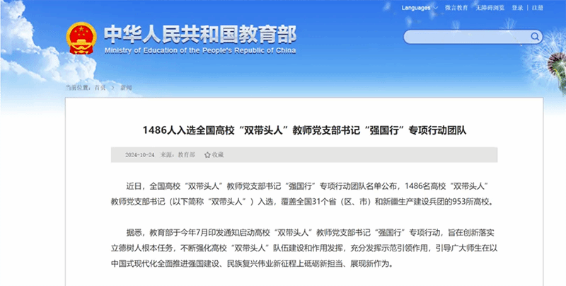 据悉,教育部于今年7月印发通知启动高校“双带头人”教师党支部书记“强国行”专项行动,旨在创新落实立德树人根本任务,不断强化高校“双带头人”队伍建设和作用发挥,充分发挥示范引领作用,引导广大师生在以中国式现代化全面推进强国建设、民族复兴伟业新征程上砥砺新担当、展现新作为。