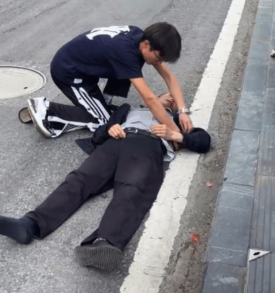 在急救过程中,张俊同学迅速考察现场环境,及时疏散人群,让空气流通。随后,他检查老人呼吸、脉搏和心跳,确认生命体征正常不急需心肺复苏等急救措施后,为防止二次伤害和气道堵塞,他将老人上衣扣子解开,并把鞋子垫在其脑后,把头部偏向一侧,并持续呼喊老人唤醒其意识。同时,他从老人包里拿出手机联系家属,待老人恢复后,他和众人便将老人扶到马路边休息,直到警察和救护车到达现场,确认其安全后才默默离开。