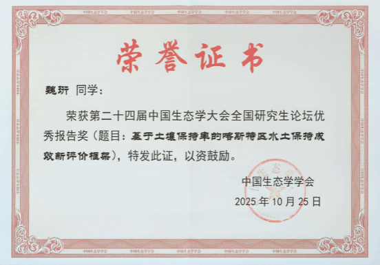 大会设立了全国生态学研究生论坛,来自清华大学、北京大学、复旦大学、中国科学院大学等高校与科研机构的490余位研究生在15个分会场做口头报告。魏珩在分会场4:草地与荒漠生态系统对环境变化的响应,以《全球气候变化及其对喀斯特植被碳汇过程的影响》为题做口头报告。其汇报内容理论创新性强、数据分析严谨,深入揭示了气候变化背景下喀斯特生态系统碳汇格局演变特征与气候驱动机制,并提出了基于土壤保持率的喀斯特区水土保持成效新评价体系。报告获得现场专家一致肯定,获得优秀研究生报告奖。