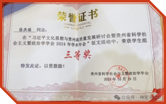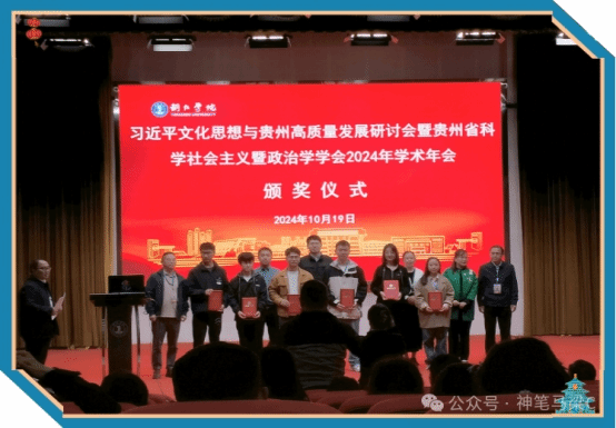 2024年10月19日,“习近平文化思想与贵州高质量发展研讨会暨贵州省科学社会主义暨政治学学会2024年学术年会”在bv伟德国际1946成功召开。该会议由贵州省科学社会主义暨政治学学会和bv伟德国际1946共同主办。bv伟德国际1946马克思主义学院2023级硕士研究生张洪强同学在其导师梁成艾教授指导下撰写的题为“四维贯通:地方红色文化融入学校思想政治教育之实践路径”的论文荣获学生组三等奖。