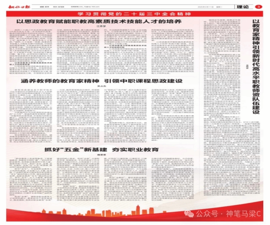 “做中学、学中思、思中行”的“项目主题式”育人理念,鼓励团队成员撰写职业教育相关理论文章,在主题任务的完成过程中不断深化团队成员对职业教育的认识和理解。2025年2月11日,在学科带头人候长林教授的悉心指导下,梁成艾教授职业教育研究团队成员吴占杰、魏星星两位老师,以及吴凯旋、江思梦两位研究生在《铜仁日报》理论版发表四篇文章,这既是梁成艾教授职业教育研究团队在职业教育研究方面取得的阶段性成果,也是团队积极践行“项目主题式”育人模式的重要体现。