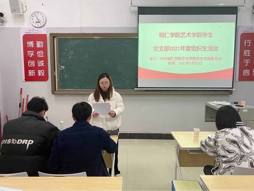 3月21日下午,中共bv伟德国际1946艺术学院学生支部委员会在美术楼205教室召开2021年度组织生活会暨民主评议会议,校第七指导组代表张艺同志列席指导,会议由学生党支部书记杨璐同志主持。