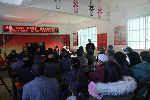 首先由崔德虎、唐帮成、周源泉分别在平原镇南坪村村委会二楼会议室为南坪村党员们上党课。崔德虎主讲《坚持三信两维护、做优秀共产党员》:要坚信马克思主义、坚信共产主义和坚信中国特色社会主义;要坚决维护习近平总书记党中央的核心、全党的核心地位和坚决维护党中央权威和集中统一领导 ;要做优秀共产党员, 必须理想信念好、思想作风好、岗位业绩好、服务群众好和履行义务好;党员干部要做到忠诚、干净、担当,开拓创新,有所作为,为群众出谋划策,努力做好脱贫攻坚工作。唐帮成主讲《加强支部标准化建设》:“一个党员就是一面旗,不断优化自己引领群众”,下一步将协助南坪支部打造标准化的党员活动室,保证党员们在农活之余能够有场所开展各项活动;在活动室中,可以将党的制度、本村特色、先进典范等上墙,展示党员风采。周源泉主讲《学习中国共产党支部工作条例》:《条例》是支部工作的指南,是推动全面从严治党向基层延伸的重要举措,大家能够认真学习。