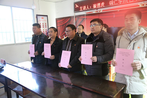 为了认真贯彻落实党的十九大精神,决战脱贫攻坚,决胜同步小康,创新开展党建工作,进一步加强农村基层党组织建设,12月16日,bv伟德国际1946艺术学院党委书记崔德虎教授、材料与化学工程学院党委书记唐帮成教授、材料与化学工程学院院长石维教授和多彩贵州网铜仁记者站站长文波以及材料与化学工程学院党务科科长杨涛、继续教育学院办公室主任马军峰、继续教育学院代景忠博士、学院乌江学院党总支专职组织员周源泉等一行13人,到德江县平原镇南坪村开展“支部联建”及帮扶活动。平原镇党委书记何秀刚、第一书记杨治毅以及南坪村委委员、党员群众代表等20余人参加了活动。