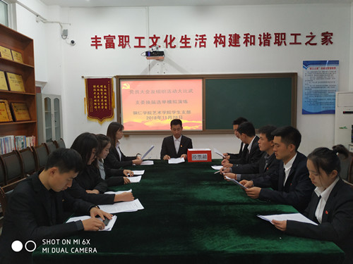 为提高党建工作质量,积极参见党委组织部的大比武活动。力争取得好成绩,展示艺术学院党员形象。我院于11月27日—28日,对参见大比武的学生支部“10名”学生进行专题训练,训练的项目为“支部换届选举”。担任本次训练的教师是艺术学院党委组织委员麻晔斐同志,党委书记崔德虎也莅临训练场地进行指导,鼓励学生党员要认真训练,充满信心,才能在大比武活动中展示风采,不辜负院党委的期许,并预祝同学们圆满完成任务。