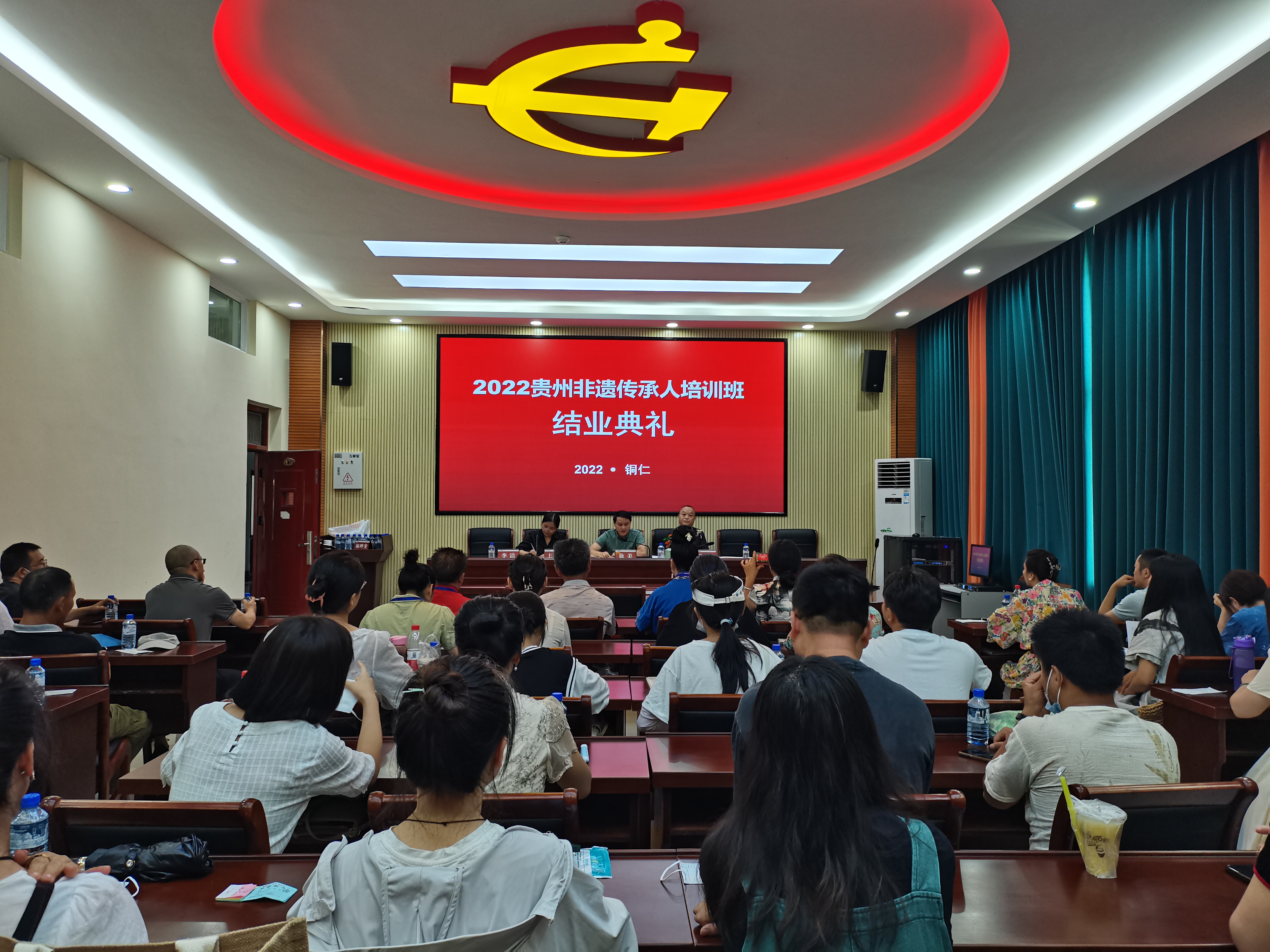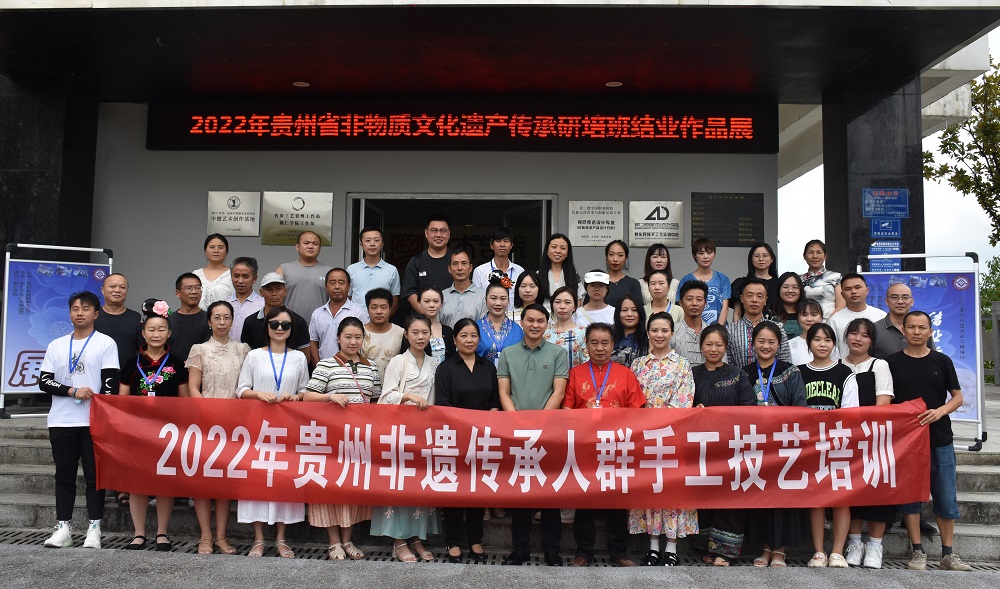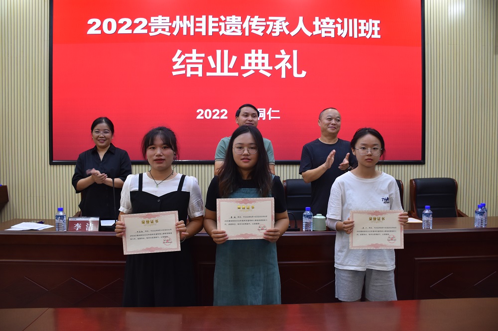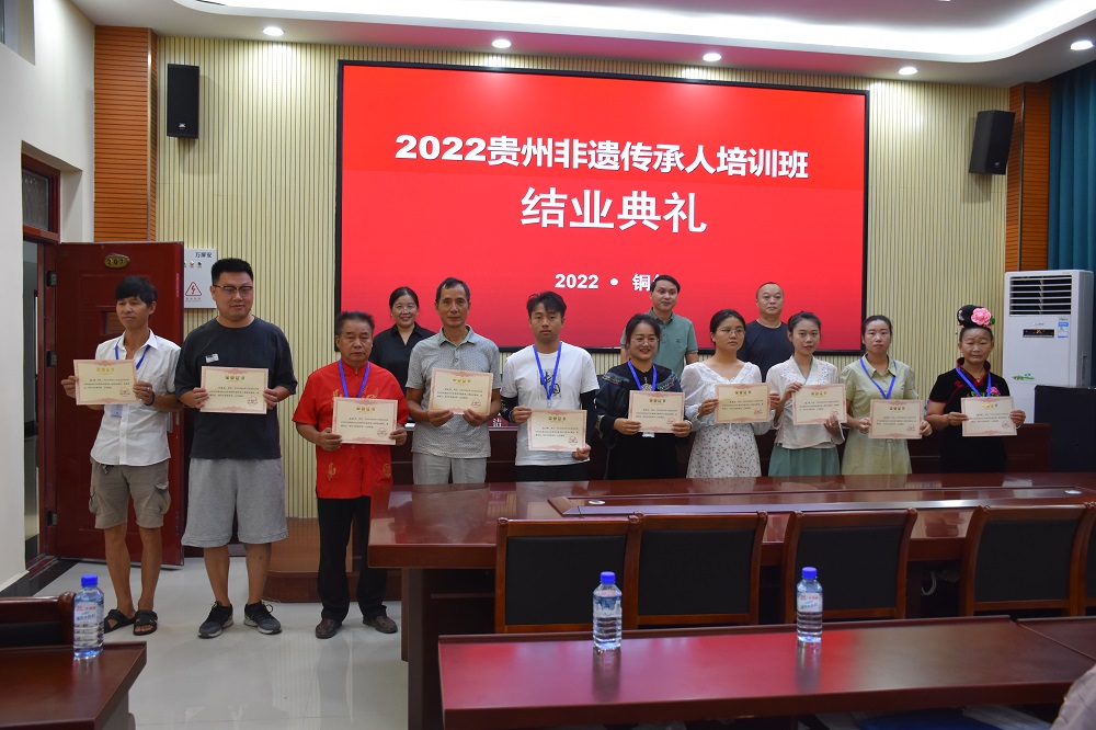 8月28日,由贵州省文化和旅游厅主办、铜仁市文体广电旅游局协办、伟德官网承办的2022年贵州省非物质文化遗产传承人群手工技艺培训班结业典礼在艺术学院举行。艺术学院党委书记徐美、院长李洁、副院长龙庆华,艺术学院非遗工作站教师,培训班全体学员参加典礼。