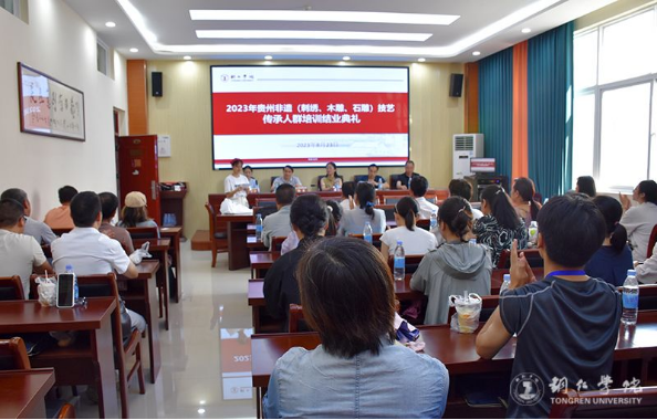 8月23日,由贵州省文化和旅游厅主办、铜仁市文体广电旅游局协办、我院承办的2023年贵州省非物质文化遗产传承人群手工技艺培训班结业典礼在院多动能会议室举行。院党委书记徐美、副院长谢云中,铜仁市文体广电旅游局非遗科科长刘彪,铜仁市周逸群纪念馆馆长杨文静,院非遗工作站全体教师及培训班全体学员参加典礼。