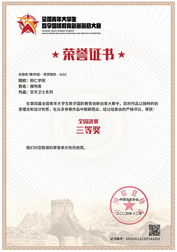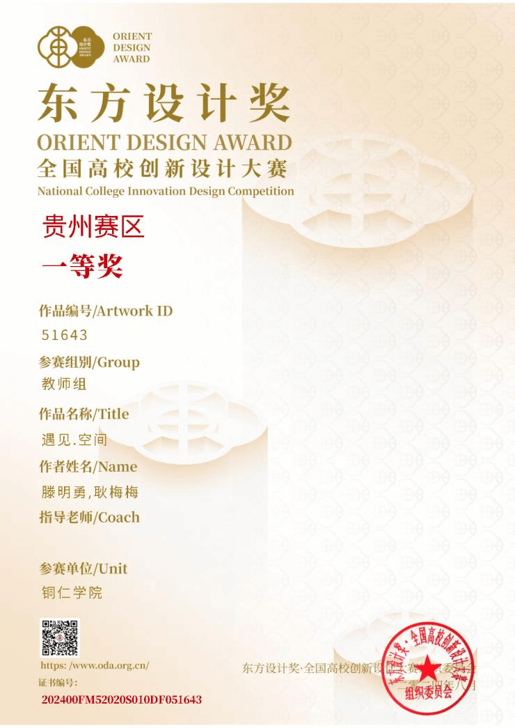 我院美术与设计系教师滕明勇教授,2024年在多项全国性设计竞赛中获奖。8月,滕明勇教授的设计作品《遇见·空间》《深蓝世界》《毕业影响》分别获得全国高校创新设计大赛组委会举办的“东方设计奖”一二三等奖。9月,设计作品《智联和平盾空间站设计》获得东方创意之星设计大赛组委会举办的东方创意之星主题设计赛三等奖。12月,两组设计作品《空天卫士系列》《和平空间基站设计》都获得中国信息协会举办的“全国青年大学生数字国防教育创新创意大赛”教师组贵州赛区二等奖,《空天卫士系列》部分作品还进入全国决赛并获得三等奖。