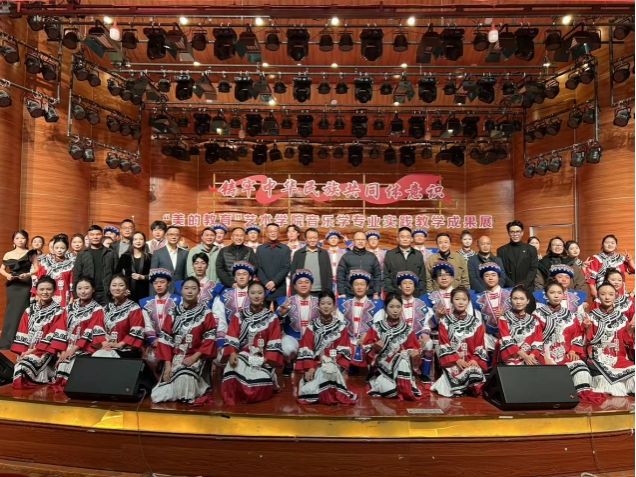 随后,由2023级音乐学专业全体同学与班主任老师谭景元带来班歌《向光而行,生声不息》,这首班歌是由该班同学吴代飞作词作曲。 这次汇报音乐会还有来自云南彝族的梅葛调《猪和羊的起源》,《盘古开天辟地》,彝族的《左脚舞》,侗族的(侗族大歌)《夏蝉之歌》、白族的《麻雀调》等等轮番登场,婉转的唱腔、欢快的舞姿,让在场观众沉浸式感受不同民族文化的绚丽多彩;最后全体同学合唱《爱我中华》更是将展演推向高潮,全体演员与台下观众齐声高歌,歌声回荡在礼堂的每一个角落,传递出“中华民族一家亲”的深厚情感。