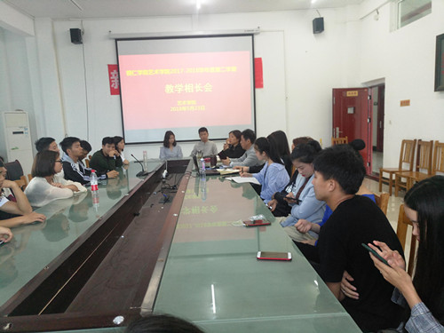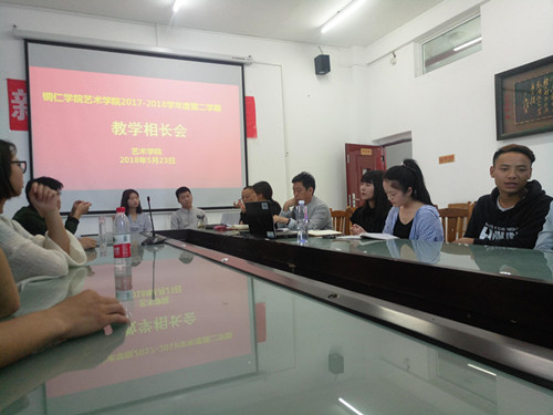 2018年5月23日下午,艺术学院教学相长会在美术楼会议室召开,会议由艺术学院院长李洁主持,教务科科长戴腾,美术系主任龙庆华,音乐系主任罗亚琴,教学秘书徐秋逸参加会议并讲话。