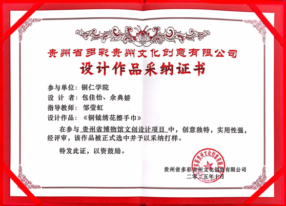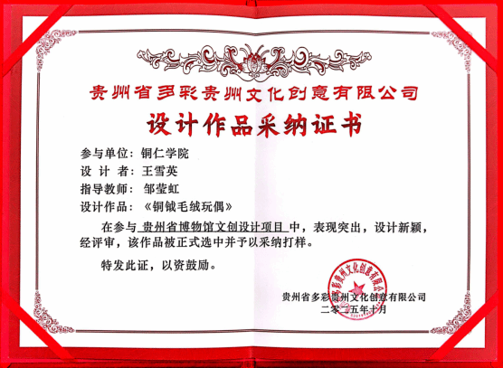 在贵州省博物馆文创设计项目中,三位同学的设计方案因创意与市场价值兼备,被该公司采纳并打样。公司领导专程到校颁发证书与奖品,以示鼓励。