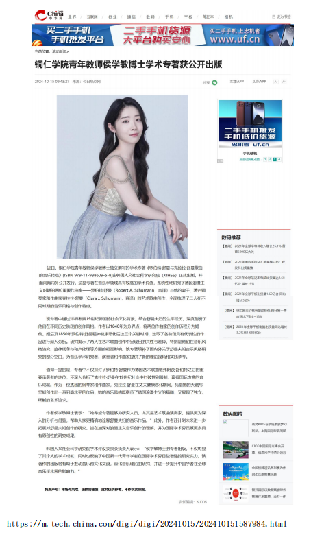 2024年10月,艺术学院音乐与表演系专任教师、青年博士侯学敏的韩国文专著《罗伯特·舒曼与克拉拉·舒曼歌曲的音乐特点》由韩国人文社会科学研究院(KIHSS)正式出版,面向海内外公开发行以来,随即得到了韩国东亚日报网、中华网及中国日报(海外版)等著名国际媒体的推介宣传。