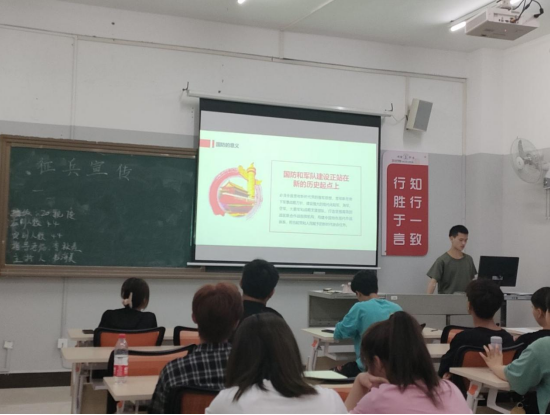 为鼓励学生积极参与应征入伍,提高兵员征集质量,推进国防和军队现代化建设,艺术学院于2021年6月7日晚上19:30在美术楼和音乐楼以班级为单位开展了“征兵宣传”主题班会,艺术学院全体学生参加了本次班会。