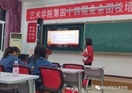 为让入团积极分子进一步了解掌握更多的团知识,增强入团荣誉感、对团的基础知识与建设的了解与认识以及思想政治素质等。11月2日,艺术学院于美术楼201教室开展团校培训,本日培训由艺术学院教务科科长张少涛老师、学生党支部宣传部委员余雁鸿老师进行专题讲座,70名学员参加培训。