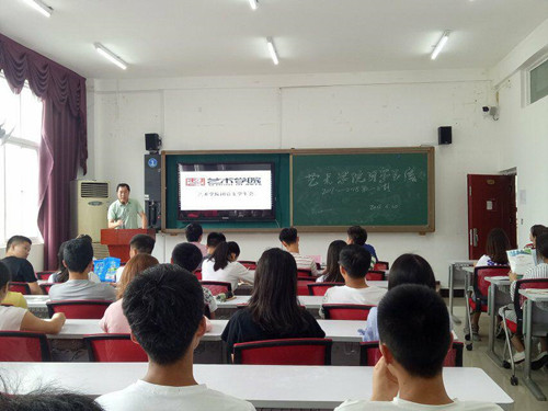颁奖仪式结束10分钟后,紧接着召开总结大会,大会伊始,参会师生们观看了过去一年里记录院内各项学生活动的视频短片,回顾了过去一学期里我院在团学工作、学风建设、运动会等各项工作活动中所取得的优异成绩。随后大会正式开始。首先由学生会主席钟佳对下学期学生会的工作发展提出了期望和要求,同时期望艺术学院学生会能够再接再厉、努力拼搏、再创辉煌。随后张少涛老师发言说明:为响应学院号召,艺术学院在本学期有步骤、有计划地开展各类形式丰富、资料广泛的活动,如:廉政书法大赛、预防网贷•抵制传销演讲及征文大赛、油画,国画,刺绣展示等活动。在总结大会的最后谢云中院长强调了此次大会为了号召:团总支学生会及各班委要充分发挥桥梁纽带和组织作用,学生干部、及各班班干要起到良好的带头和模范作用,每一个同学都要做一个人生有理想、生活有方向、学习有动力、工作有目标、言行讲礼貌、做人有原则、行为负职责的人,成为人品高尚、知识全面、技能过硬、潜力发展的好学生。最后,各学生会成员也分别在大会进行发言,他们从各自不同的角度表达了今后对于学生会的发展提出了意见及对自己立足本职、勤奋努力、用心参与各项工作的信心和决心。