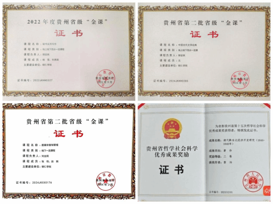 贵州省级“金课”证书、省哲社优秀成果奖励证书