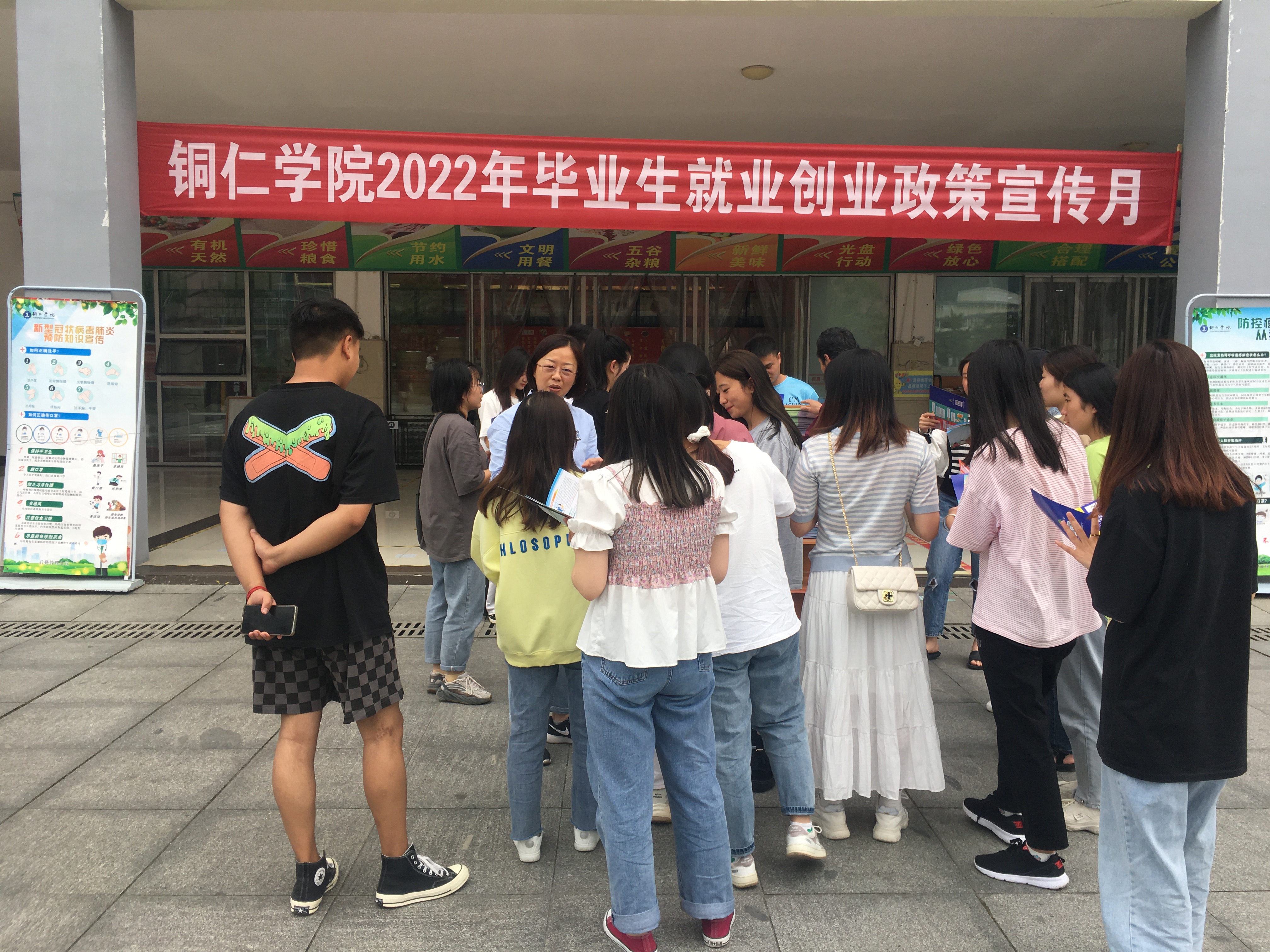 为落实教育部《关于开展2022年高校毕业生就业创业政策宣传月活动的通知》文件精神,深入开展促进就业创业服务工作,在学生中全面宣传就业创业政策,铜仁学院招就处于5月7日下午在丹桂餐厅公共区域开展就业创业政策宣传、咨询活动。分管领导罗静副校长莅临现场与学生交流,宣传政策。招生就业处处长杨艳、副处长赵坤,招生就业处全体工作人员参与了现场政策宣讲、答疑活动。