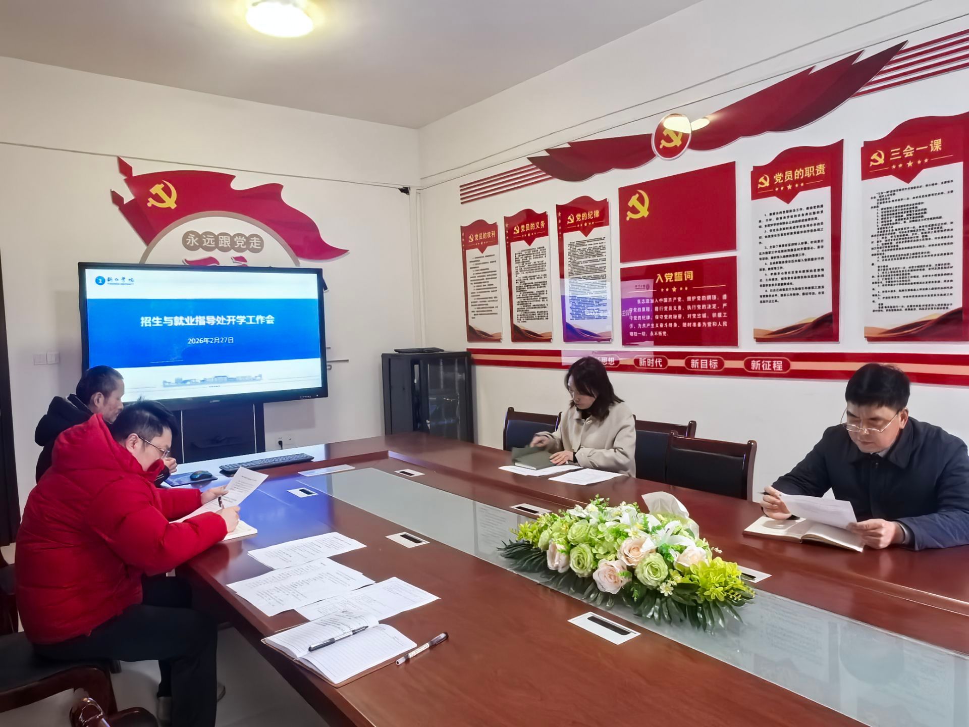 2月27日下午,招生与就业指导处在201会议室召开2026年春季学期开学工作会,部门全体教职工参加,处长胡慧主持会议。