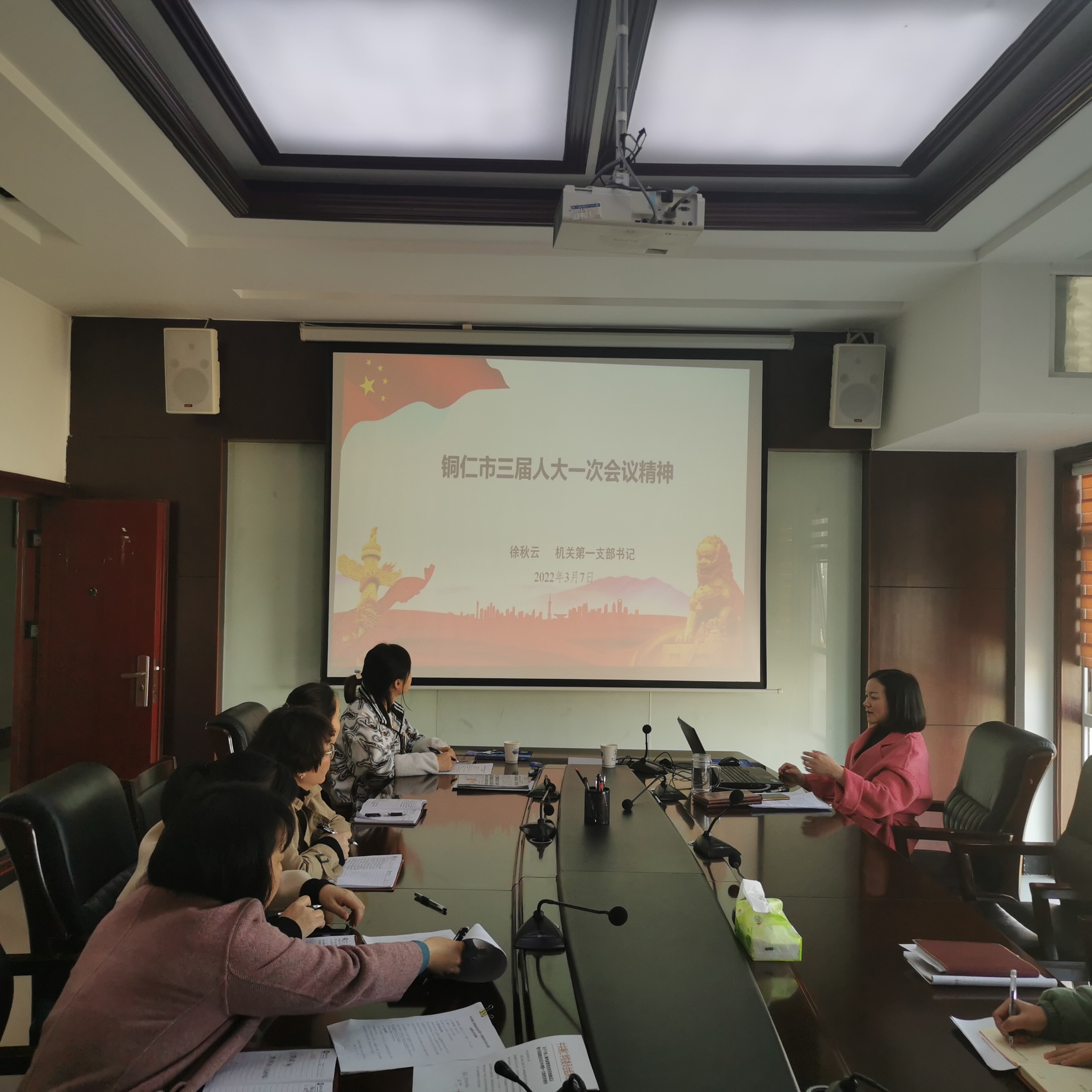 3月7日,bv伟德国际1946机关第一党支部书记徐秋云同志在行政楼8326会议室宣讲铜仁市三届人大一次会议精神,支部全体党员同志认真聆听了此次宣讲。