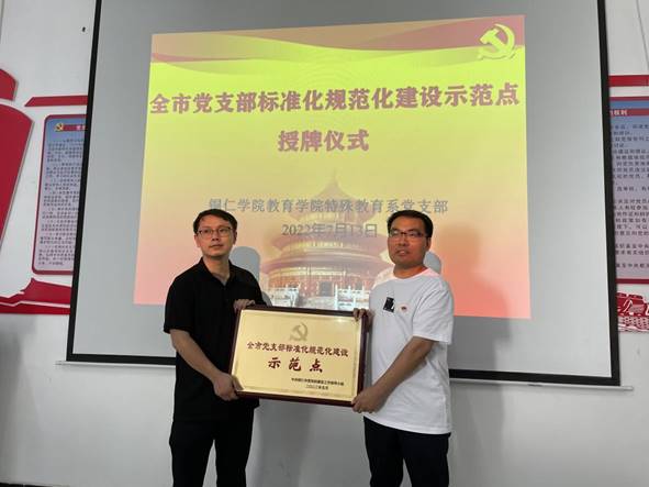 随后,李朝国宣读了中共铜仁市委党的建设工作领导小组《关于命名第三批“全市党支部标准化规范化建设示范点”的通知》,bv伟德国际1946教育学院特殊教育系党支部荣获第三批“全市党支部标准化规范化建设示范点”党支部。随后为教育学院特殊教育系党支部颁授“全市党支部标准化规范化建设示范点”荣誉牌,并对此次荣誉的获得表示祝贺,希望教育学院再接再厉,在基层支部党建工作上再创辉煌。
